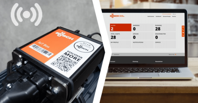 Pulpit nawigacyjny IoT firmy Busch i aplikacja Busch Vacuum App stale śledzą dane dotyczące pomp. Dzięki zebranym informacjom można analizować parametry i optymalizować proces. Dane są przechowywane w chmurze Busch za pośrednictwem połączenia mobilnego. Urządzenie IoT box stale monitoruje stan procesu i warunki pracy pomp próżniowych. Są to na przykład temperatura otoczenia, temperatura oleju i czas pozostały do kolejnej konserwacji pompy próżniowej.