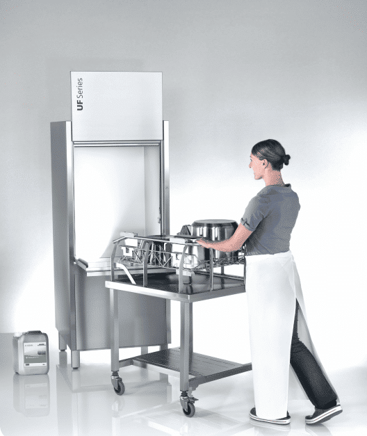 Zmywarki serii UF posiadają ekrany dotykowe i przyciski szybkiego uruchomienia, są także wyposażone w wygodne składane drzwi. Wózek z koszem, który jest dostępny jako akcesorium, pozwala na szybkie zebranie i łatwy transport nieporęcznych i dużych naczyń. Przy maszynie kosz jest po prostu przesuwany bezpośrednio z wózka do wnętrza maszyny. Po umyciu wszystko można równie szybko posortować i odłożyć. Zapewniając optymalną pracę w zmywalni.